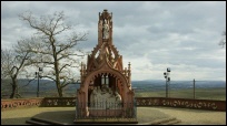 Aber zurück zur Geschichte der Kapelle an diesem einzigartigen Ort: 1689 im Krieg verwüstet, wieder aufgebaut, dann 1795 zerstört, woraufhin man erst 1813 die Aufbauarbeiten wieder in Angriff nahm, da in diesem Jahr von den Soldaten Napoleons das Fleckfieber eingeschleppt wurde und man sich an das alte Rochus-Gelübde erinnerte. Es hat wiederum geholfen, auch wenn da nur ein recht einfaches Kapellchen errichtet wurde, in das 1889 der Blitz einschlug. Ein Jahr in dem es den Bingern durch den florierenden Weinhandel richtig gut ging, und so geizte man nicht beim Wiederaufbau des abgebrannten Bauwerks. Ja, hat er schon toll gemacht, der Kirchenarchitekt Max Meckel aus Frankfurt. Ich bin auf jeden Fall begeistert vom Gotteshaus und ganz besonders von dem Außenchor mit offener Kanzel. So Gottesdienste im Freien sind doch phantastisch, zumal in einem solch herrlichen Umfeld. |