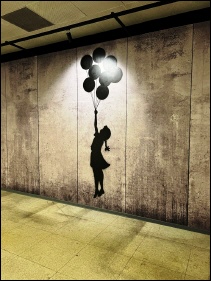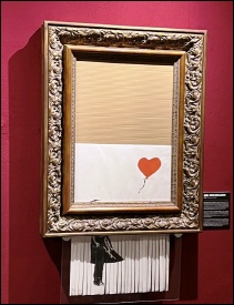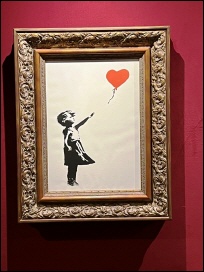 Auch bin ich amüsiert über seine Aktionen, wie z.B. die, dass er den Pariser-Louvre mit einer Mona Lisa mit Smile-Gesicht unbemerkt bereicherte und seinen bekanntesten Coup, dass sich das Bild „Girl with Balloon“ bei der Versteigerung im Moment des Zuschlags selbst zerstörte. |
