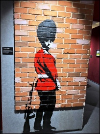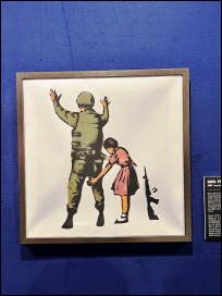 Um die 100 originalgetreue Nachbildungen von Banksy-Bildern, Graffitis, Fotografien, Skulpturen und Video-Installationen, mit interessanten Erläuterungen, die den Besucher dem Phantom Banksy näherbringen, gab es zu bestaunen. Ich wusste z.B. nicht, dass der Künstler sein aktuellstes Bild „Game Changer“, auf dem ein Junge mit einer Krankenschwester-Puppe als Superheldin zu Coronazeiten zu sehen ist, im letzten Frühjahr für knapp 20 Mio Euro versteigert wurde. |
