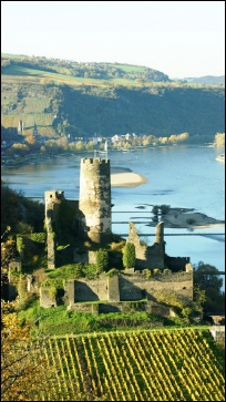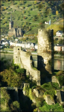 Oberdiebach ist gut ausgestattet mit Hinweisschildern und Wegweisern auf Wanderrouten, und so suchte ich für einen Sonntag die kürzeste Route aus: „Rheinburgenschutzhütte 1,3 km“, das las sich gut. Unser Haus steht direkt gegenüber der Fürstenberghalle, dem Ausgangspunkt, dann links ab, hoch auf den Feldweg, der oberhalb von Oberdiebach entlang führt und eine schöne Aussicht auf den Ort bietet. |