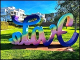 Aber zurück zu den Kunstwerken unter dem Motto „Hier und Jetzt“, bei denen es um Klimawandel, den Umgang mit Ressourcen, Alltagsfragen, Zusammenleben etc. geht. Manch ein Objekt machte es leicht, zu erkennen, was es vermitteln möchte, wie die Stahlskulptur „Love Hate“ in Form eines Ambigramms, ein Wort, dass in verschiedene Richtungen gelesen werden kann. Mit wenigen Schritten, wird aus Liebe Hass. Dann das gelbe Iglu, das im Hafenpark zum Besuch einlädt und die Thematik Wohnraum aufwirft. |