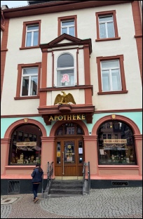 Wissen Sie, wie alt die älteste Apotheke Deutschland ist? Laut Internet ist das die Löwen-Apotheke in Trier, 1241 wurde sie erstmals urkundlich erwähnt, und „unsere“ Adler- Apotheke, gegründet am 4.9.1636, ist immerhin die älteste des Binger Landes und eine mit der ältesten von ganz Rheinland-Pfalz. Und dann so etwas? 1710 wurde das Haus, das die Apotheke beherbergt, errichtet und ist ein Kulturdenkmal der Stadt. Ich bin davon ausgegangen, dass man deshalb nicht nur das Gebäude allein, sondern auch die altehrwürdige Apotheke mit seiner großartigen gut erhaltenen spätklassizistischen Innenausstattung von 1889 schützt, bewahrt und ehrt. |