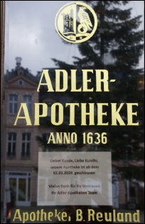 Mein erster Beitrag im neuen Jahr ist kein Ausflugstipp, nein nicht wegen des Wetters, sondern weil mich ein Bericht in der „Allgemeinen Zeitung“ vom 2.1. sehr betroffen machte. Schlagzeile: "SCHLUSS NACH FAST VIER JAHRHUNDERTEN, Adler-Apotheke am Speisemarkt hat zum Jahresende geschlossen." |