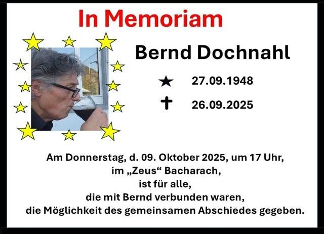 Und jetzt? Bernd hinterlässt eine Lücke, die niemand füllen kann. Eine Lücke in meinem Leben und ohne Frage, in dem vieler anderer. Er wird fehlen im Bacharacher Stadtbild! Mein Mitgefühl gilt seiner Familie und all denen, denen er ein Freund war, denn solch ein Freund, der mit einem nicht nur durch Freud, sondern auch durch großes Leid geht, einfach da ist und hilft, ist selten geworden.