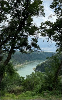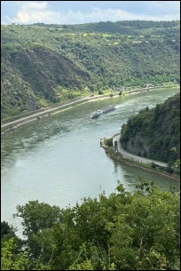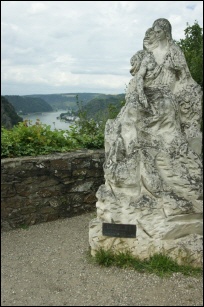 Also, so wie ich am Binger Mäuseturm kein einziges Mäuschen zu Gesicht bekam, genau so war von der sagenumwobenen Loreley hoch droben von unten nichts zu sehen. Na, ich meine ja nicht sie selbst, aber irgendwas ihr zu Ehren, zumal nahezu alle Passagiere der Ausflugsschiffe Handys oder Kameras zücken, wenn es an dem Felsen vorbeigeht, auf dem die Schönheit gesessen haben soll, ihr langes güldenes Haar kämmte und mit ihren weiblichen Reizen und Sirenengesängen die Seeleute die Untiefen und Klippen des Stroms vergessen ließ, so dass ihre Schiffe am Felsen zerschellten und sie mit Mann und Maus untergingen. Das Motiv, dass die Touristen erhaschen? Nun ein stinknormaler Fels, mit Schriftzug und Flagge. Das war es. |