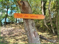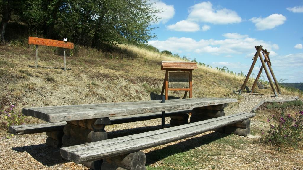 So, hier noch der Weg zur Entspannung und den Glücksmomenten: Mich führt er über den Aussichtspunkt „Pilz“, den ich Ihnen schon mal vorgestellt habe. Hier noch einmal einen Link darauf, allderweil mittlerweile schon 4 Jahre vergangen sind, dass ich darüber geschrieben habe. (Aussichtspunkt Pilz, Oberdiebach). Von hier aus ist der „Tisch des Weines“ nicht zu verfehlen, denn ein großes hölzernes Namensschild weist Ihnen den Weg zu der Tafel mit der fantastischen Aussicht.