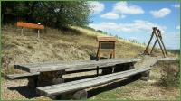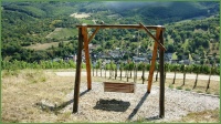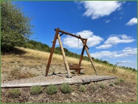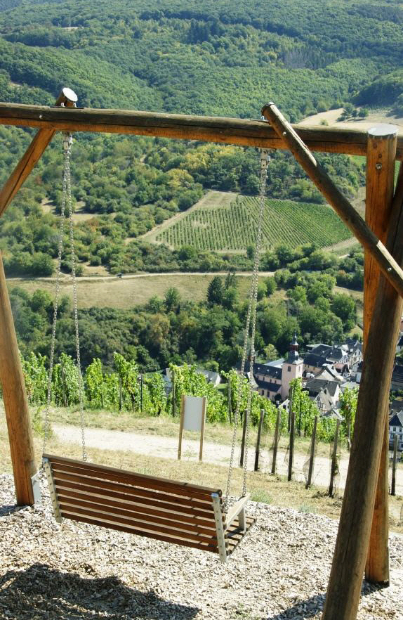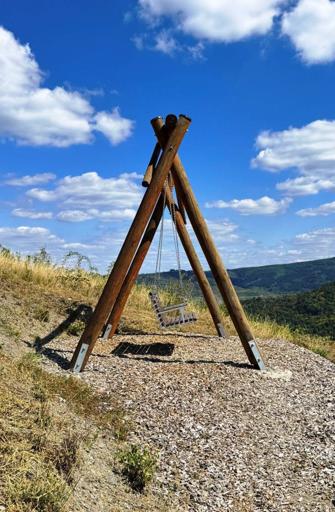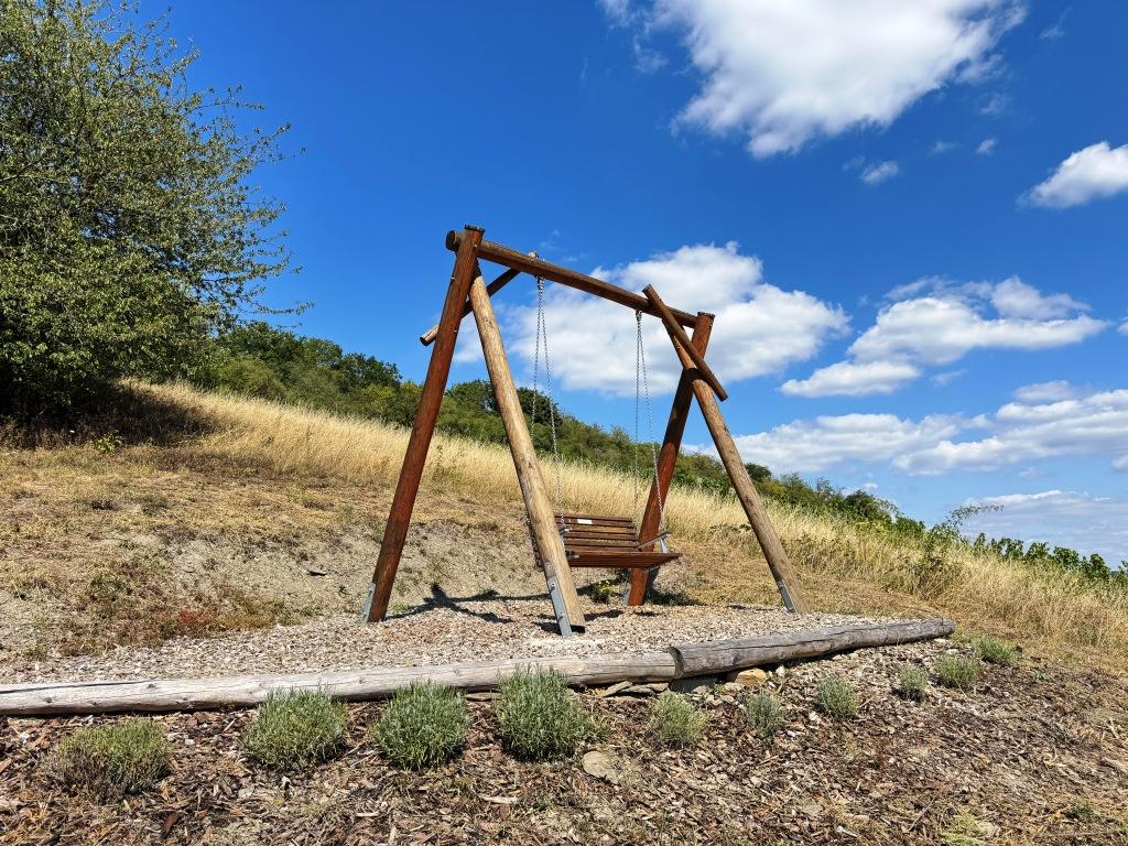 Ja, und da ist noch was, sozusagen, die Kirsche auf der Torte: Eine Wingertschaukel, die einlädt, mal ganz beschwingt die Zeit zu vergessen, unbeschwert Kind zu sein und höher und höher hinauszukommen. Habe ich doch kürzlich in der Mediathek einen Bericht gesehen, der besagte, dass Schaukeln in einer entspannten Umgebung der Natur gesundheitsfördernd ist und einen Riesenspaß macht…Nun, letzteres wusste ich schon lange.
